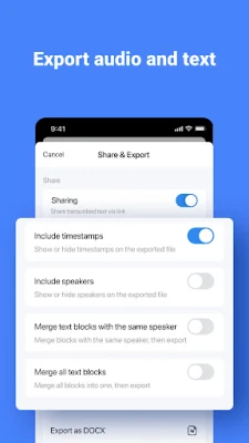 Save transcribed text in formats such as txt, docx, excel, pdf, or srt (subtitles). Export transcriptions with recorded timestamps and timelines, or share them via a link with colleagues and friends.